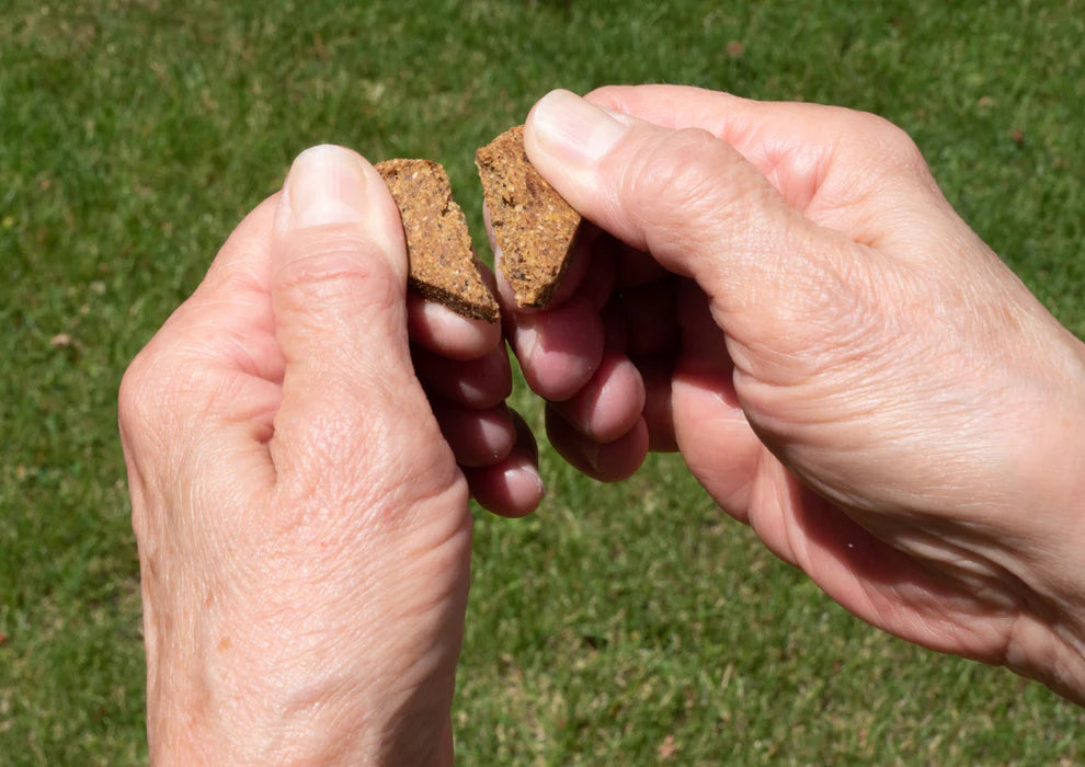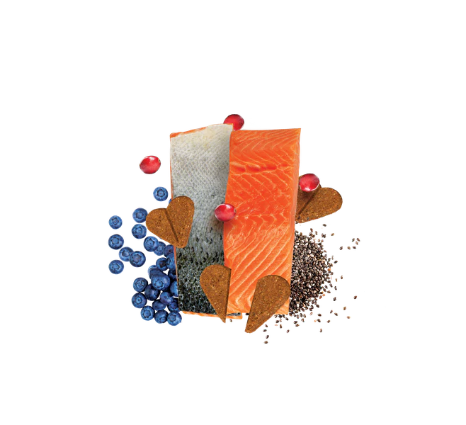 Snack horneado súper premium para perros, con salmón como primer ingrediente. Fórmula sin cereales, sin gluten, sin ingredientes modificados genéticamente, enriquecida con super-alimentos (quinoa, arándanos, arándanos rojos, semillas de chía, kelp) para piel brillante, digestión saludable y vitalidad.