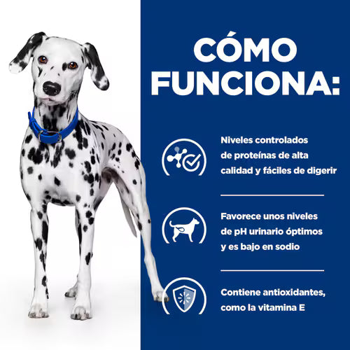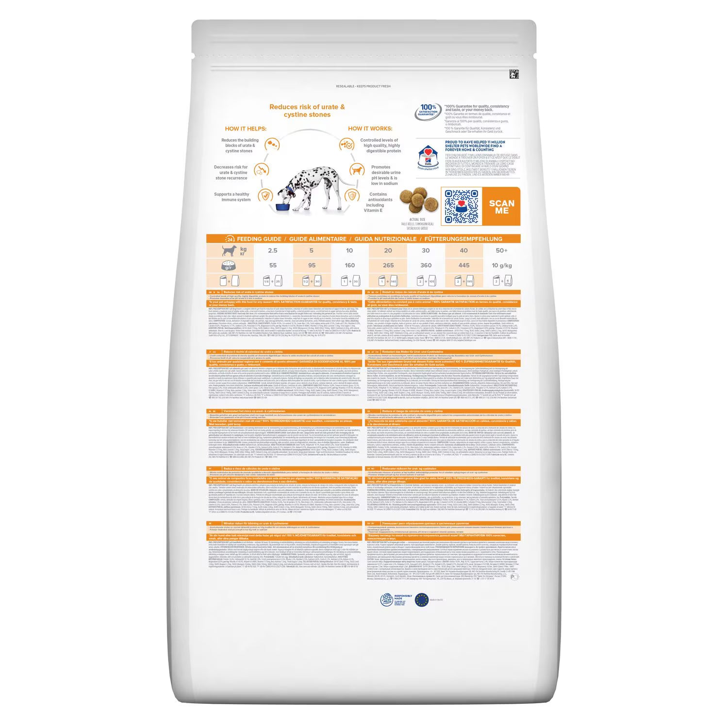 Hill's PRESCRIPTION DIET u/d alimento para perros es un alimento dietético completo para la reducción de la formación de cálculos de urato y la reducción de la formación de cálculos de cistina en perros adultos. Este alimento tiene un contenido moderado de aminoácidos sulfúricos, un bajo contenido de purinas, un bajo contenido de proteínas de alta calidad, fuentes seleccionadas de proteínas y propiedades alcalinizantes de la orina.