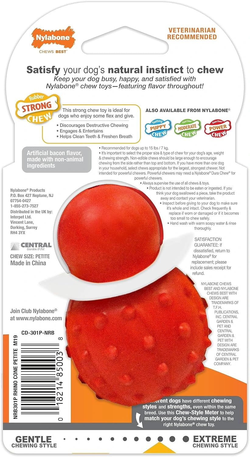 Juguete masticable resistente Nylabone Rubber Strong Chew con sabor a tocino, diseñado para perros pequeños que disfrutan masticar y jugar. Ideal para mantenerlos entretenidos y apoyar la higiene dental.